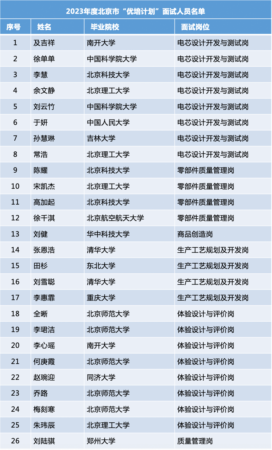 1、电芯工艺开发岗(1名)岗位相关要求见《北京市2024年度“优培计划”招聘(Ⅱ)应届优秀大学毕业生简章》